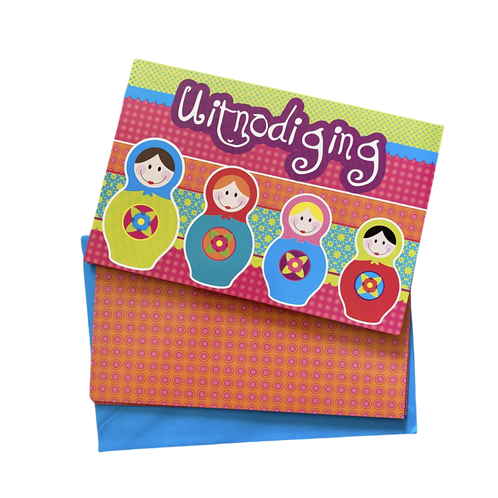 Nodig je gasten in stijl uit met deze set van 5 dubbele uitnodigingskaarten met vrolijke Matroesjka’s! De kleurrijke illustraties en unieke uitstraling maken ze perfect voor een feestelijke gelegenheid, een high tea, een kinderfeestje of wat voor feestje dan ook. Origineel, sfeervol en met een glimlach verstuurd!