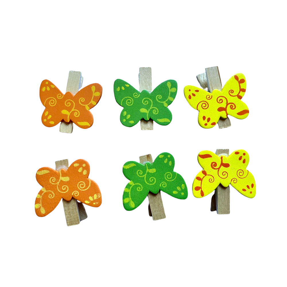 6 stuks Knijpers Vlinders in de kleuren Oranje, groen en geel
